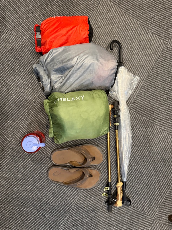 Everything you see here is all I have in my pack. I even have an extra pair of shoes in that grey bag which aren’t even mine.